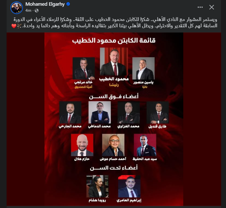 تحيا مصر، وكتب محمد الجارحي عبر "فيس بوك": ويستمر المشوار مع النادي الأهلي شكرًا للكابتن محمود الخطيب على الثقة، وشكرًا للزملاء الأعزاء في الدورة السابقة لهم كل التقدير والاحترام".