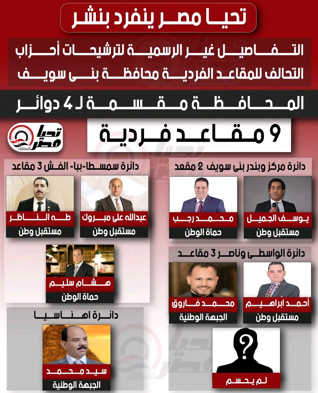 تحيا مصر ينفرد بنشر ترشيحات أحزاب التحالف على المقاعد الفردية في بني سويف