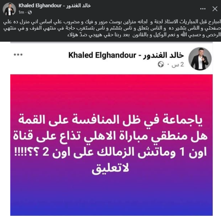 تحيا مصر، وكتب خالد الغندور عبر حسابه الرسمي"فيس بوك":" إمبارح قبل المباريات الاستاذ لجنة و لجانه منزلين بوست مزور و فيك، و مضروب علي أساس اني منزل ده علي صفحتي، و الناس بتشير ده، و الناس بتعلق و ناس بتشتم و ناس بتستغرب حاجة في منتهي القرف، و في منتهي الرخص و حسبي الله و نعم الوكيل، و بالقانون بعد ربنا حقي هييجي ضدّ هؤلاء".