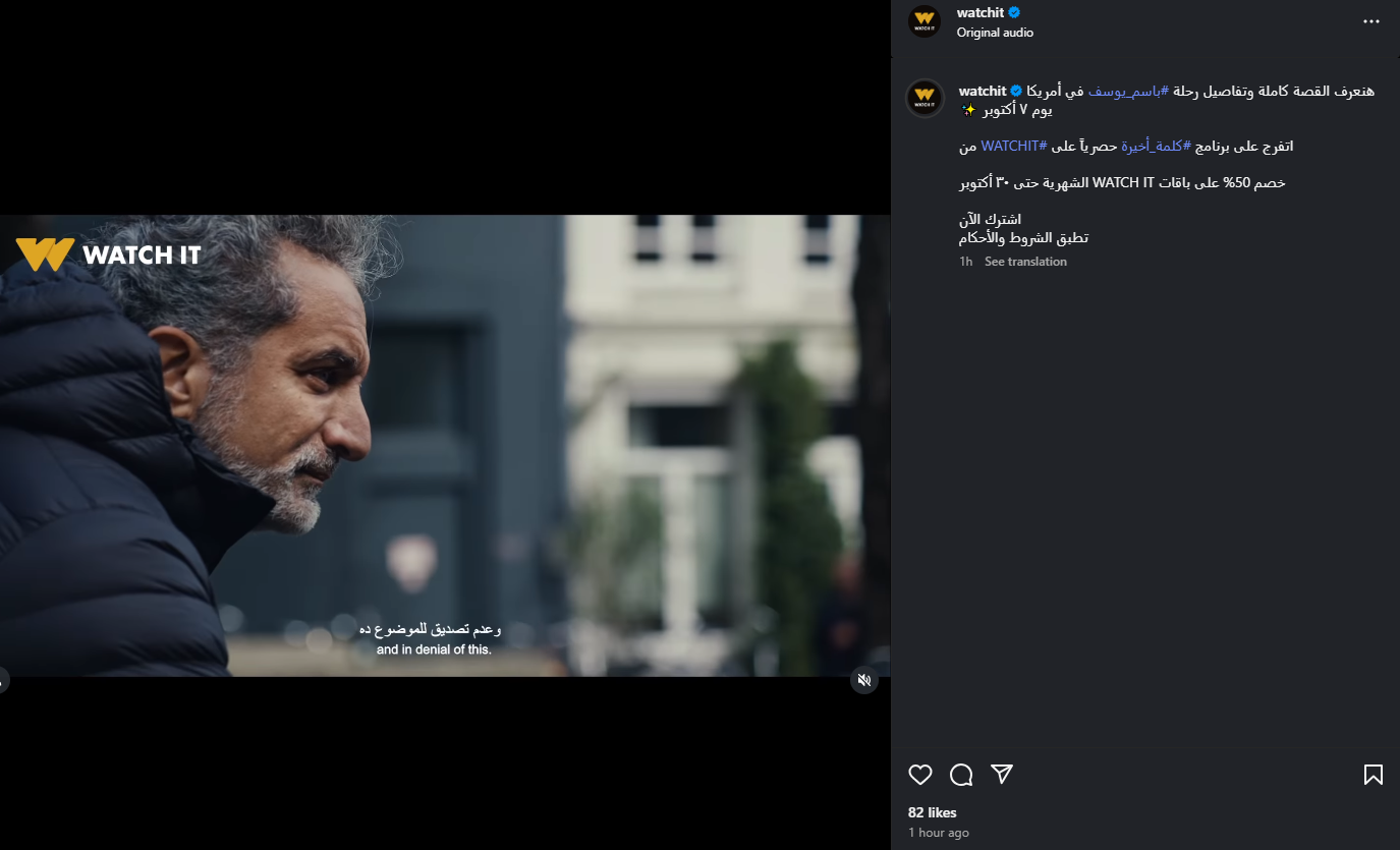 وشارك منصة watch it، فيديو ترويجي لحلقات الإعلامي باسم يوسف، عبر برنامج كلمة أخيرة، وفقا لما رصده موقع تحيا مصر، عبر صفحتها الرسمية على موقع التواصل الاجتماعي إنستجرام، وعلقت عليها: هنعرف القصة كاملة وتفاصيل رحلة باسم يوسف في أمريكا يوم 7 أكتوبر.