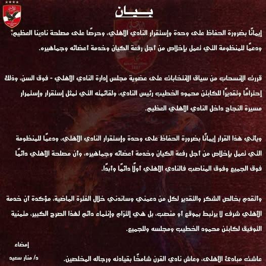 إيمانًا بضرورة الحفاظ على وحدة وإستقرار النادي الأهلي، وحرصًا على مصلحة نادينا العظيم