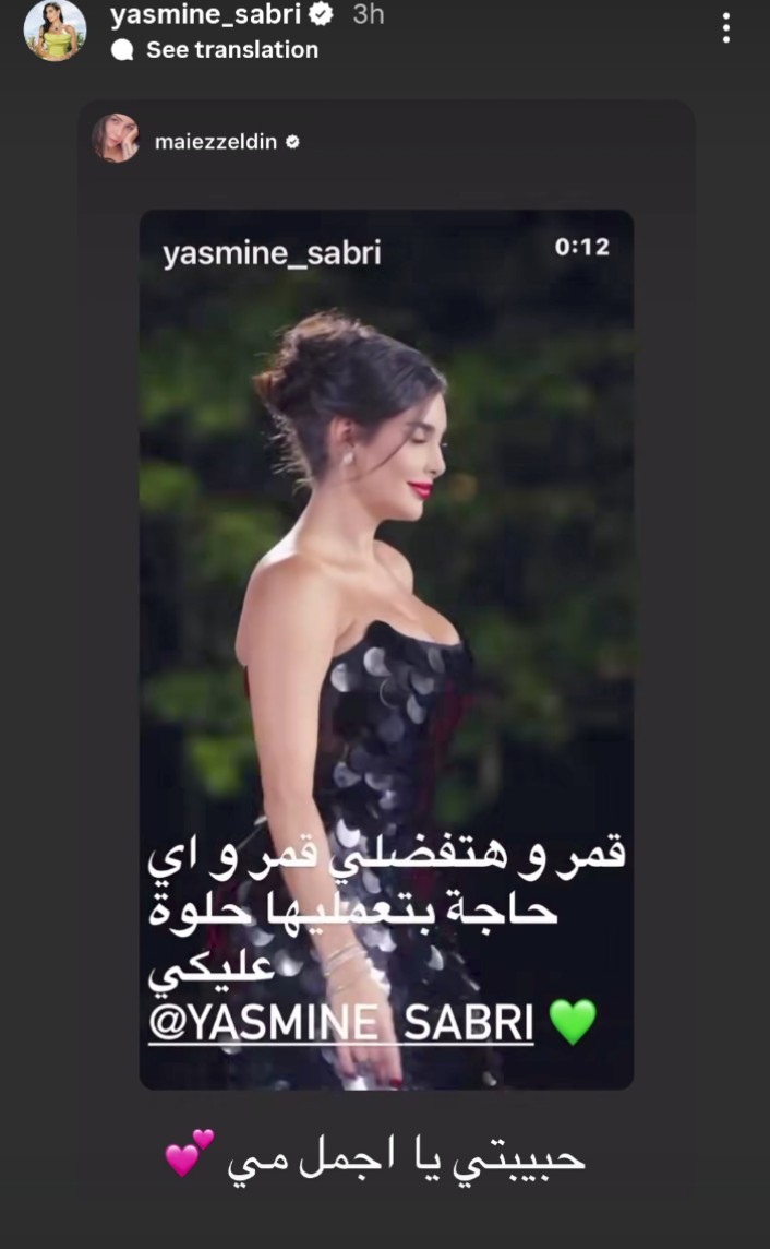 تحدثت الفنانة مي عز الدين عن إطلالة ياسمين صبري الأخيرة، معبرة عن إعجابها بها عبر حسابها الرسمي على موقع تبادل الصور والفيديوهات انستجرام: "قمر.. وأي حاجة بتعمليها بتليق عليكي"، وقامت ياسمين صبري بالرد عليها معبرة عن سعادتها بهذا التعليق، قائلة: "حبيبتي يا أجمل مي"، ورصد موقع تحيا مصر ردود أفعال النجمتين وهو ما لاقى استحسان المتابعين، الذين أشادوا بروح الدعم الإيجابية بين الفنانات، وابتعادهن عن أجواء المنافسة السلبية، مؤكدين أن العلاقات الراقية داخل الوسط الفني تضيف للمشهد مزيدًا من الجمال والاحترام.
