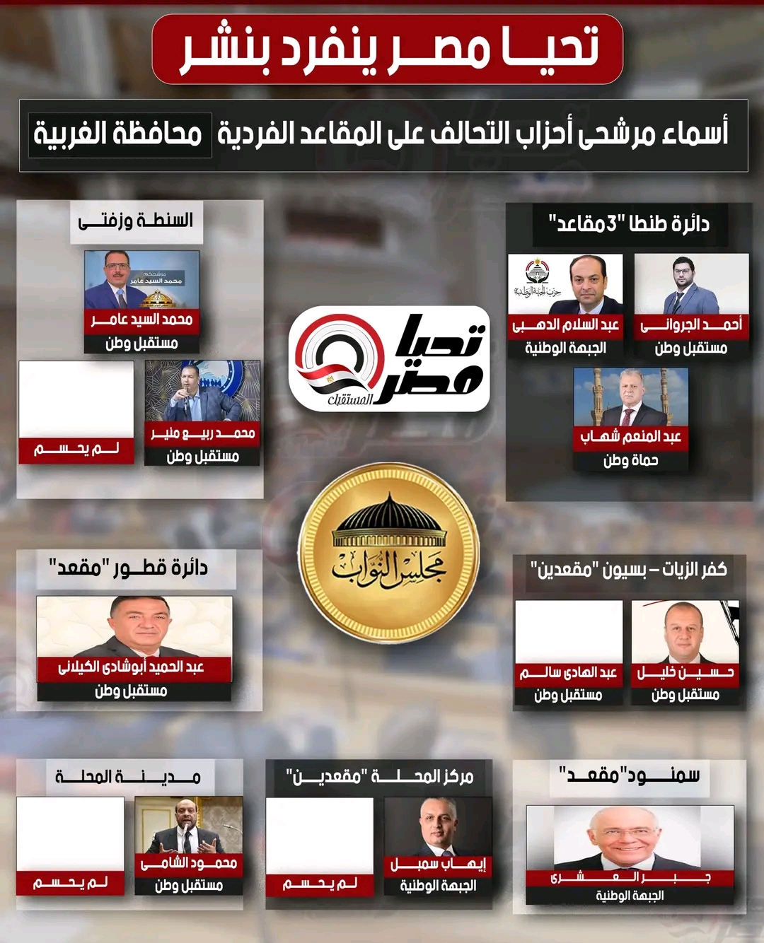 تحيا مصر ينفرد بنشر أبرز مرشحي أحزاب التحالف بمحافظة الغربية في انتخابات مجلس النواب 2026