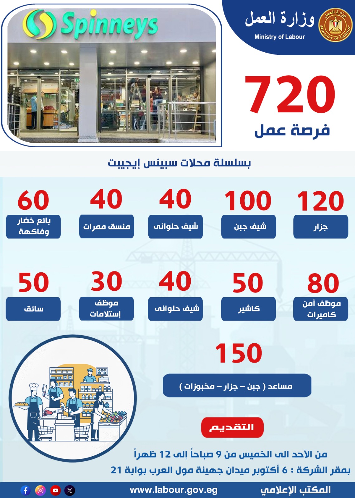 أعلنت وزارة العمل عن إتاحة 720 فرصة عمل جديدة بالتعاون مع سلسلة متاجر سبينس إيجيبت، تنفيذًا لتوجيهات الوزير محمد جبران بضرورة التوسع في توفير فرص تشغيل لائقة للشباب، ودعم الجهود الوطنية الهادفة إلى خفض معدلات البطالة وتعزيز فرص الاندماج في سوق العمل الرسمي.