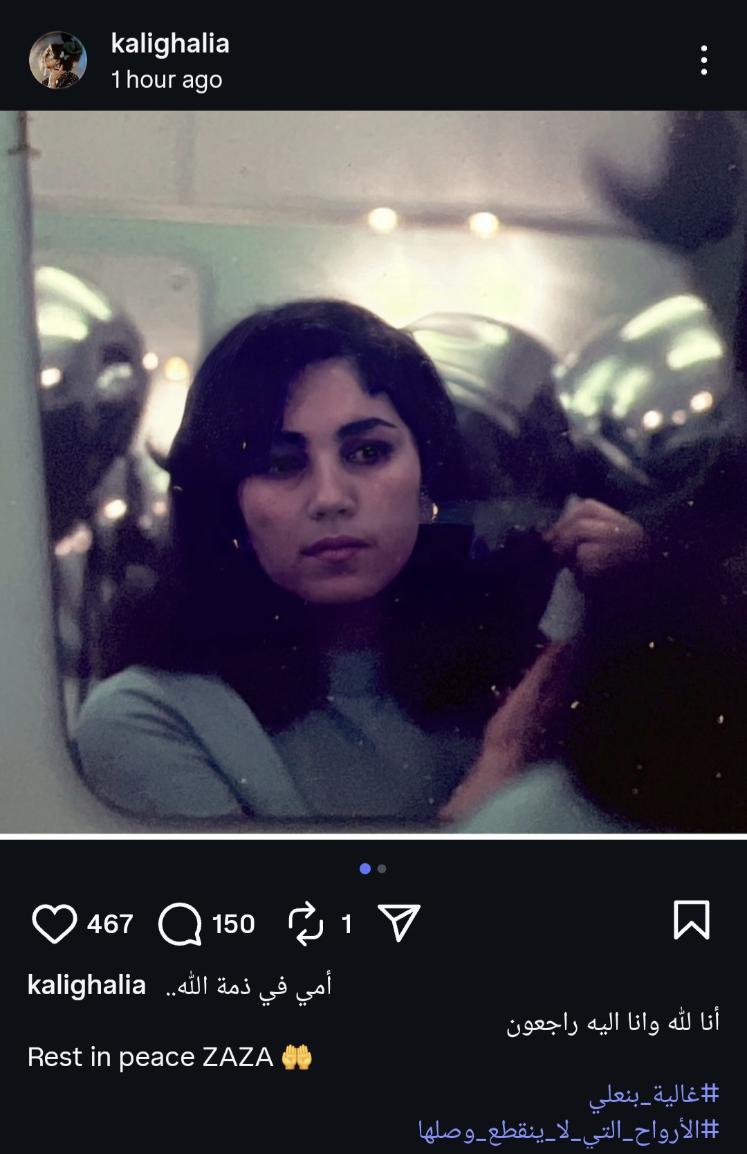 ونشرت غالية بن علي في منشورها الذي يرصده موقع تحيا مصر صورة لوالدتها، وعلقت عليها وكتبت: أمي في ذمة الله إن لله وإنا إليه راجعون.