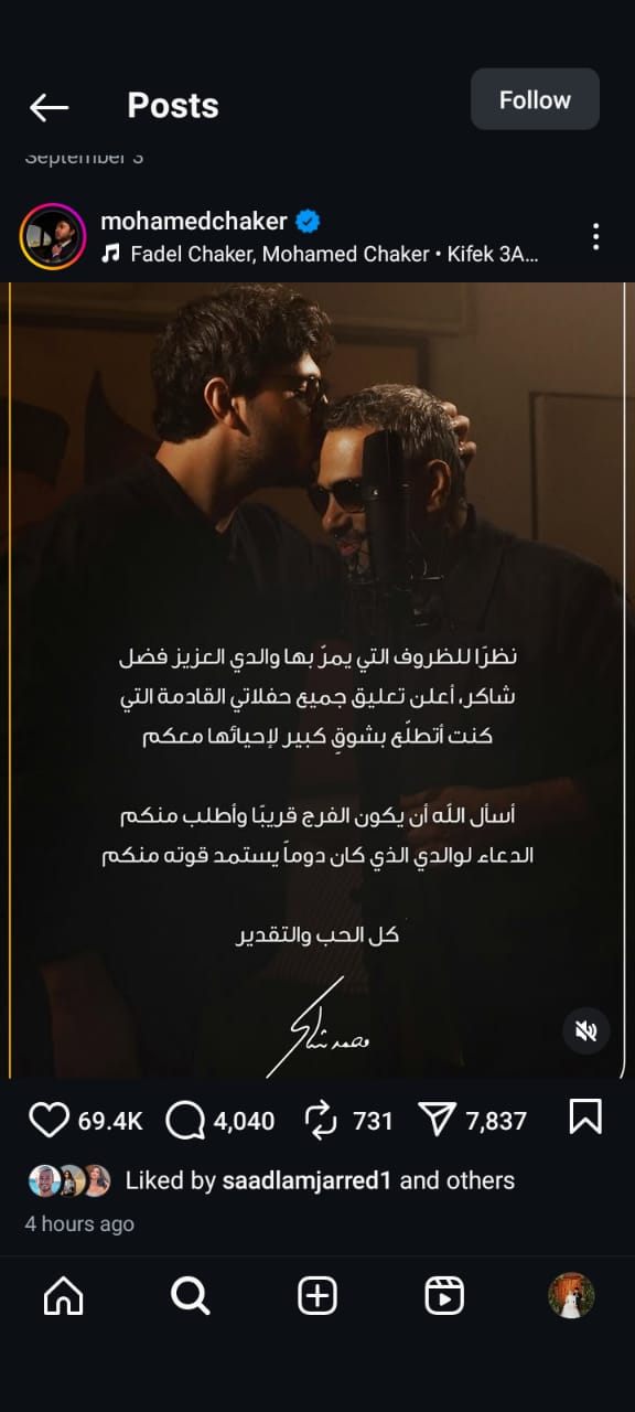 وكتب محمد فضل شاكر في منشور رصده موقع تحيا مصر على حسابه الرسمي بموقع تبادل الصور والفيديوهات انستجرام: نظرا للظروف التي يمر بها والدي العزيز فضل شاكر، أعلن تعليق جميع حفلاتي القادمة التي كنت أتطلع بشوف كبير لاحياءها معكم، أسأل الله أن يكون الفرج قريبا وأطلب ممكن الدعاء لوالدي الذي دوما يستمد قوته منكم.. كل الحب والتقدير.
