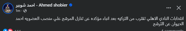 تحيا مصر، وكتب أحمد شوبير عبر حسابه الرسمي"فيس بوك": انتخابات النادي الأهلي تقترب من التزكية بعد انباء مؤكده عن تنازل المرشح علي منصب العضوية أحمد الحيوان عن الترشح".