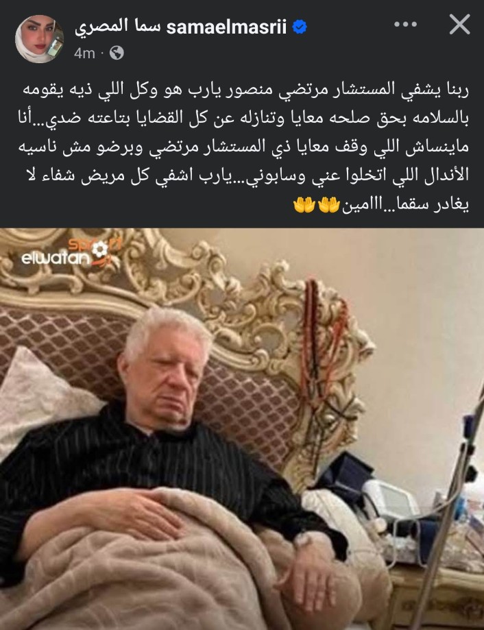 وكتبت سما المصري عبر حساباتها الرسمية على مواقع التواصل الاجتماعي منشورًا رصده موقع تحيا مصر، عبرت فيه عن حزنها على مرض المستشار مرتضى منصور طالبة الدعاء له وأكدت على مواقف قام بها تجاهها أكدت على وقوفه إلى جانبها، و قالت سما المصري في منشورها: "ربنا يشفي المستشار مرتضى منصور يا رب، هو وكل اللي زيه، يقومه بالسلامة بحق صلحه معايا وتنازله عن كل القضايا اللي كانت ضدي... أنا ما بنساش اللي وقف معايا زي المستشار مرتضى، وبرضو مش ناسية الأندال اللي اتخلوا عني وسابوني... يا رب اشفي كل مريض شفاء لا يغادر سقما، آمين."