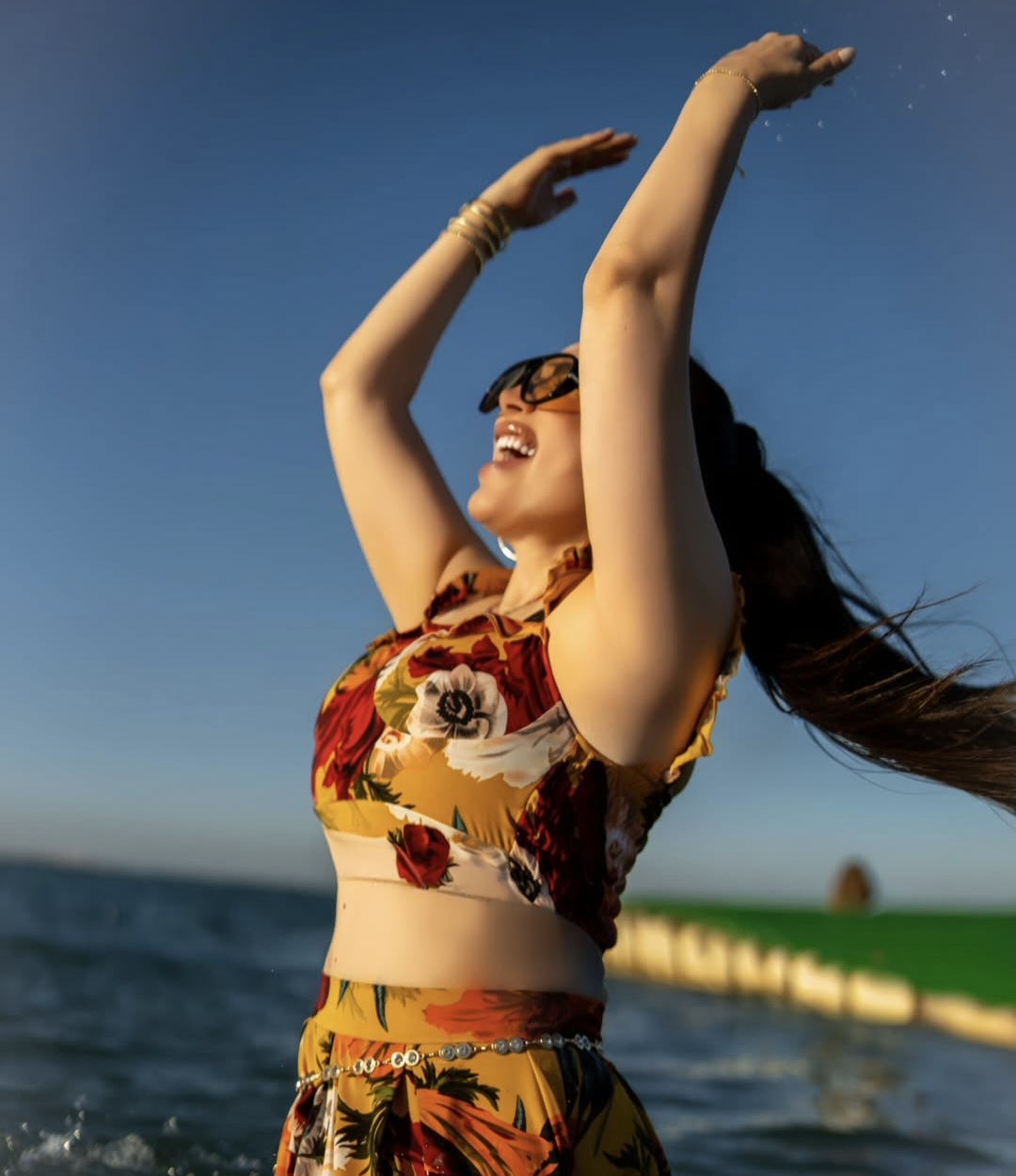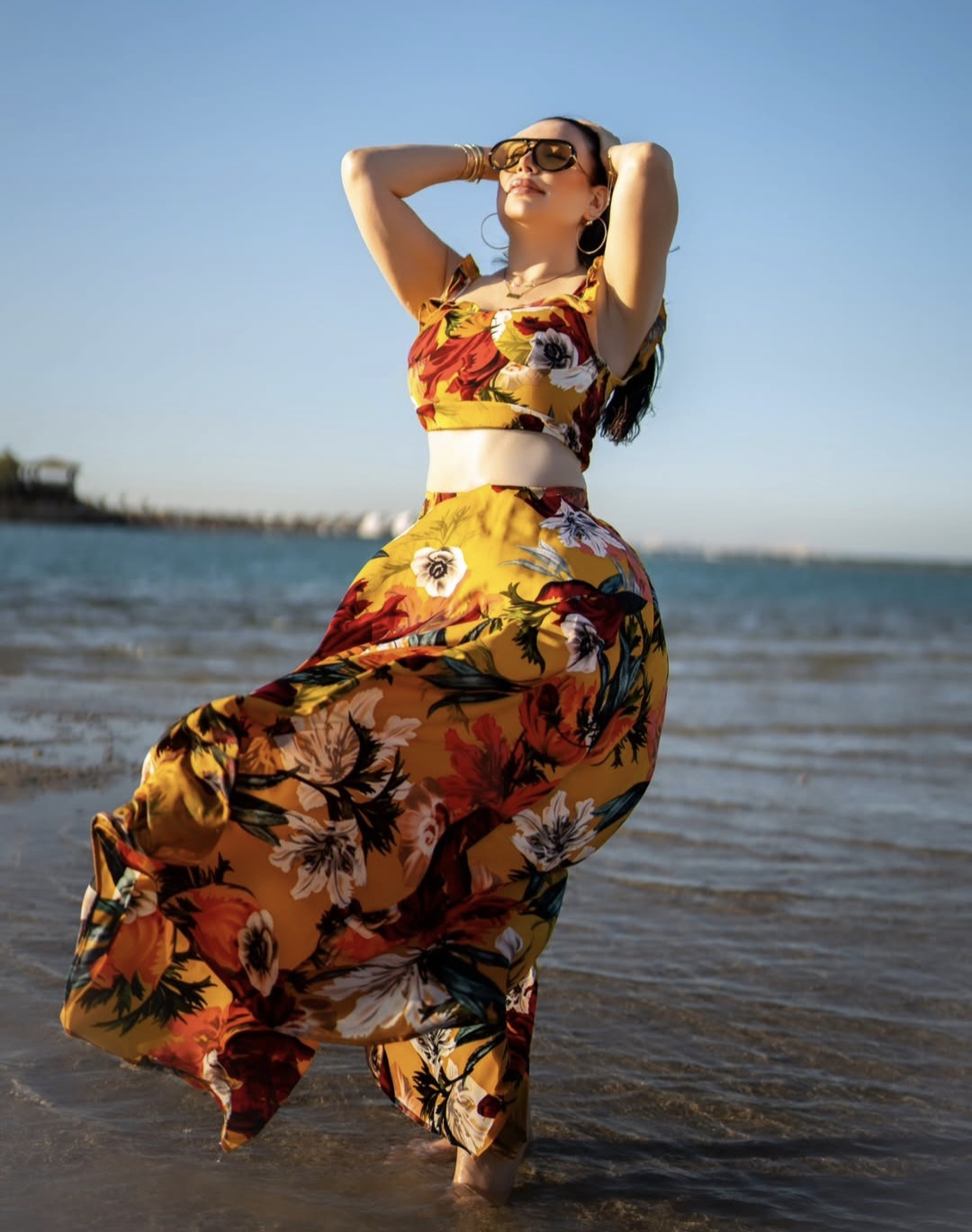 وظهرت عبير صبري في الصور التي يرصدها موقع تحيا مصر بفستان مزهر بألوان زاهية يغلب عليه الأصفر والأحمر، بتصميم يعكس أجواء الصيف المبهجة، نسقته مع نظارة شمسية كبيرة وحلقات ذهبية، ما أضفى على إطلالتها لمسة من الأناقة والأنوثة.