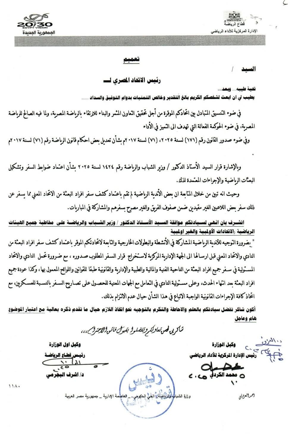 مستند|إنذار حاسم من وزارة الرياضة للاتحادات والأندية ضد سفر البعثات الرياضية