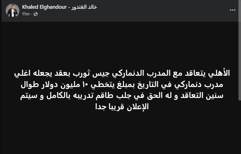 تحيا مصر، وكتب خالد الغندور عبر حسابه الرسمي"فيس بوك": الأهلي يتعاقد مع المدرب الدنماركي جيس ثورب بعقد يجعله اغلي مدرب دنماركي في التاريخ بمبلغ يتخطي ٣ مليون دولار سنويا و له الحق في جلب طاقم تدريبه بالكامل، وسيتم الإعلان قريبا جداً".