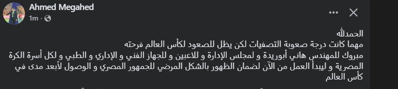 تحيا مصر، وكتب أحمد مجاهد عبر حسابه الرسمي"فيس بوك": الحمدلله مهما كانت درجة صعوبة التصفيات لكن يظل للصعود لكأس العالم فرحته".