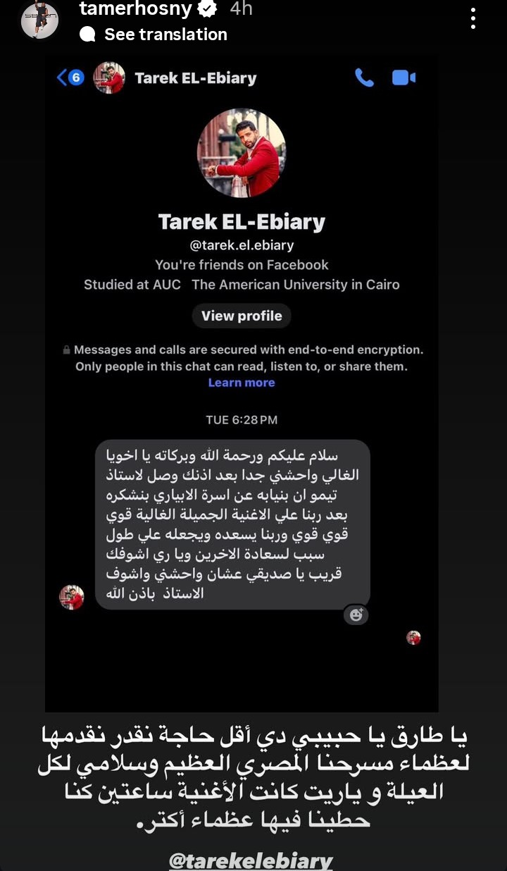 من جانبه رد تامر حسني عبر منشور رصده موقع تحيا مصر خلال حسابه الرسمي بموقع تبادل الصور والفيديوهات انستجرام على خاصية ستوري: يا طارق يا حبيبي دي أقل حاجة نقدر نقدمها لـ عظماء مسرحنا المصري العظيم وسلامي لكل العيلة وياريت كانت الأغنية ساعتين كنا حطينا فيها عظماء أكثر.
