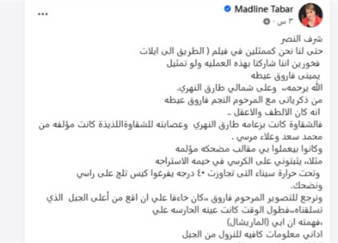 وشاركت مادلين طبر صورة وعلقت عليها: يميني فاروق عيطة الله يرحمه، وعلى شمالي طارق النهري، من ذكرياتى مع المرحوم النجم فاروق عيطة أنه كان الألطف والأعقل، أما الشقاوة كانت بزعامة طارق النهري وعصابته للشقاوة اللذيذة كانت مؤلفة من محمد سعد وعلاء مرسي.