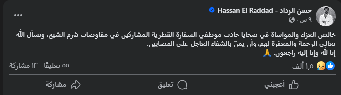 حرص الفنان حسن الرداد، على نعي مظفي السفارة القطرية في شرم الشيخ، والذين لقوا مسرعهم مساء أمس السبت، خلال تواجدهم في مصر للمشاركة ضمن التحركات الدبلوماسية الجارية.