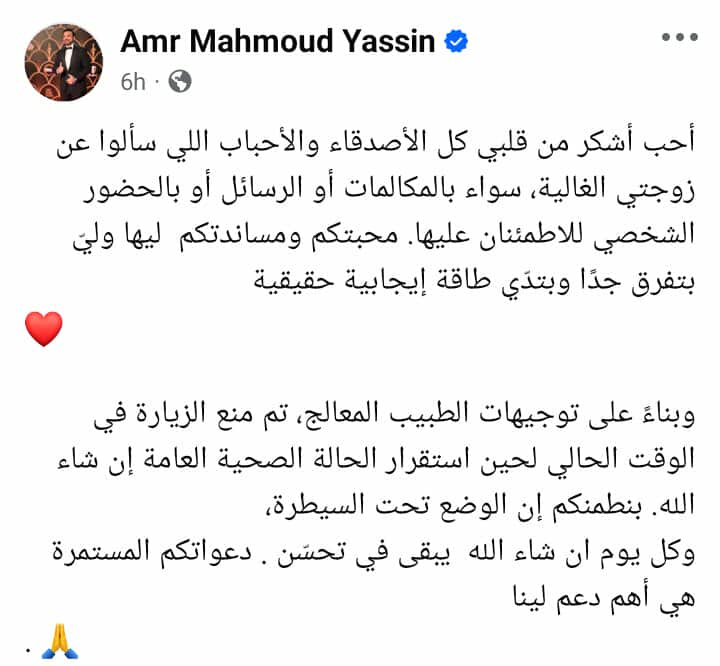 وكتب عمرو محمود ياسين في منشور رصده موقع تحيا مصر على حسابه الرسمي بموقع التواصل الاجتماعي فيسبوك: أحب أشكر من قلبي كل الأصدقاء والأحباب اللي سألوا عن زوجتي الغالية، سواء بالمكالمات أو الرسائل أو بالحضور الشخصي للاطمئنان عليها. محبتكم ومساندتكم ليها وليّ بتفرق جدًا وبتدّي طاقة إيجابية حقيقية.