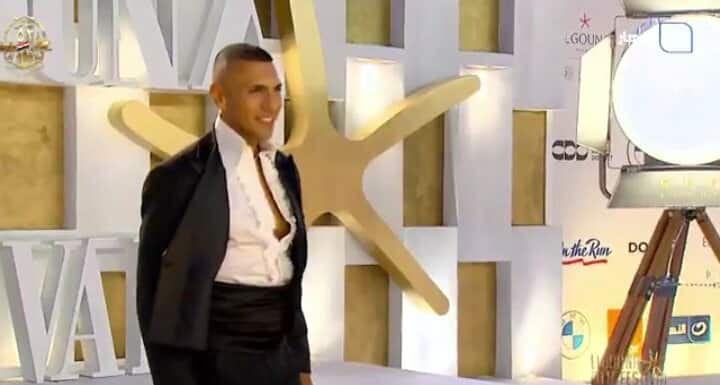 أما عن الفنان حسن أبو الروس فظهر في إطلالة غريبة للغاية، حيث ارتدى بدلة سوداء وعليها حزم اسود، وقميص ابيض، وكان قد قام بعمل لوك جديد يبدوا أنه لوك أحد أدواره الفنية.