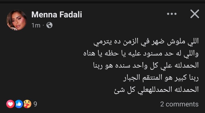 وكتبت الفنانة منة فضالي في منشورها عبر حسابها الشخصي على موقع التواصل الاجتماعي فيسبوك والذي رصده موقع تحيا مصر: “اللي ملوش ضهر في الزمن ده يترمي، واللي له حد مسنود عليه يا حظه يا هناه.. الحمد لله على كل واحد سنده هو ربنا الكبير، وهو المنتقم الجبار، الحمد لله على كل شيء”، ومنشور منة فضالي لاقى تفاعلًا كبيرًا من متابعي الفنانة، حيث انهالت التعليقات التي عبّرت عن القلق عليها، بينما حرص آخرون على دعمها نفسيًا ودعوتها لتجاوز أي أزمة تمر بها، ولم توضح منة فضالي سبب الرسالة أو المناسبة التي كتبتها فيها، وهو ما زاد من حالة الغموض حول مضمونها.