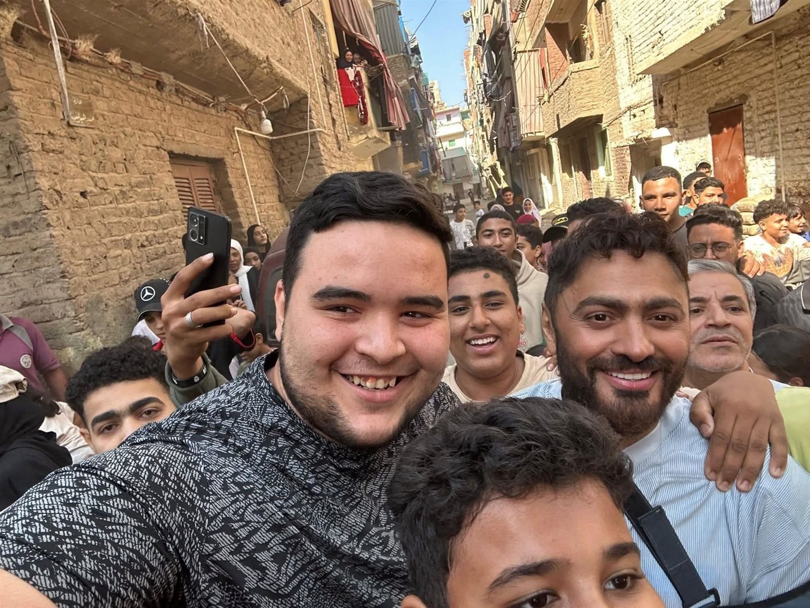 الأهالي يلتفون حول تامر حسني أثناء زيارته طفلة مصابة بالسرطان في شبين القناطر