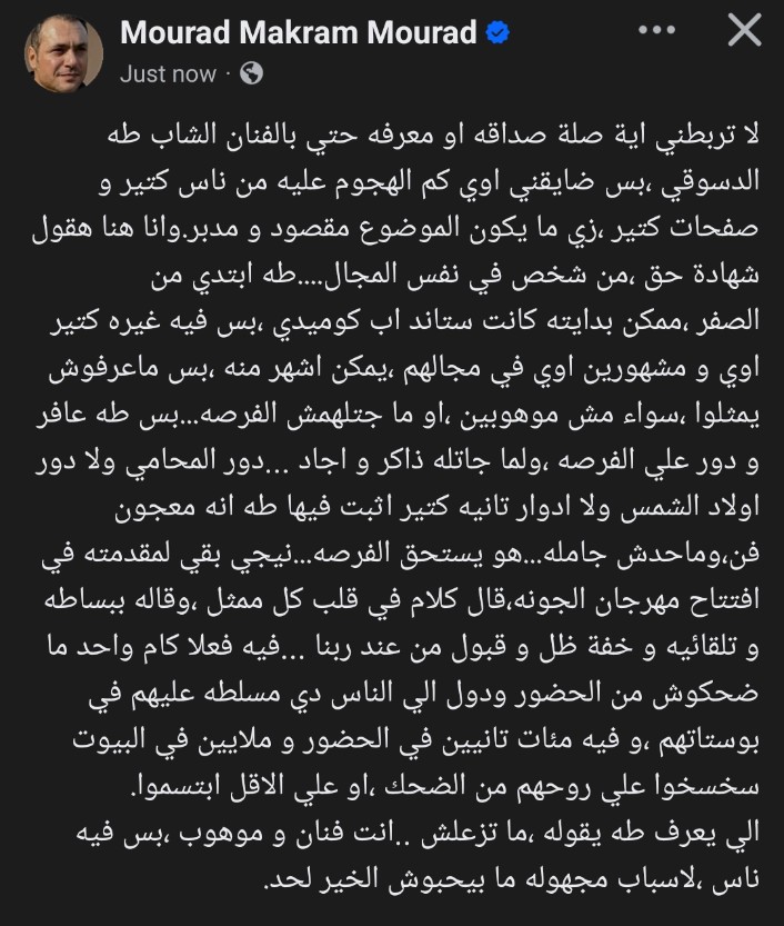 وقال الفنان مراد مكرم في منشور عبر حسابه الشخصي على موقع التواصل الاجتماعي فيسبوك: "أنا ما عنديش أي علاقة شخصية أو معرفة بطه دسوقي، لكن فعلاً ضايقني كم الهجوم اللي حصل عليه، كأنه حملة مقصودة، الراجل بدأ من الصفر، تعب، واجتهد، وطور من نفسه لحد ما وصل، وماخدش حاجة مجاملة."