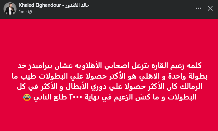 تحيا مصر، وكتب خالد الغندور عبر حسابه الرسمي"فيس بوك": كلمة زعيم القارة بتزعل اصحابي الأهلاوية عشان بيراميدز خد بطولة واحدة، و الأهلي هو الأكثر حصولا علي البطولات ".