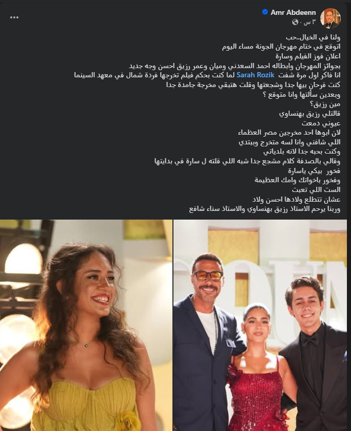 واختتم عمرو عابدين حديثه: فخور بيكي يا سارة، وفخور باخواتك وامك العظيمة الست اللي تعبت عشان تتطلع ولادها احسن ولاد، وربنا يرحم الاستاذ رزيق بهنساوي والاستاذ سناء شافع.