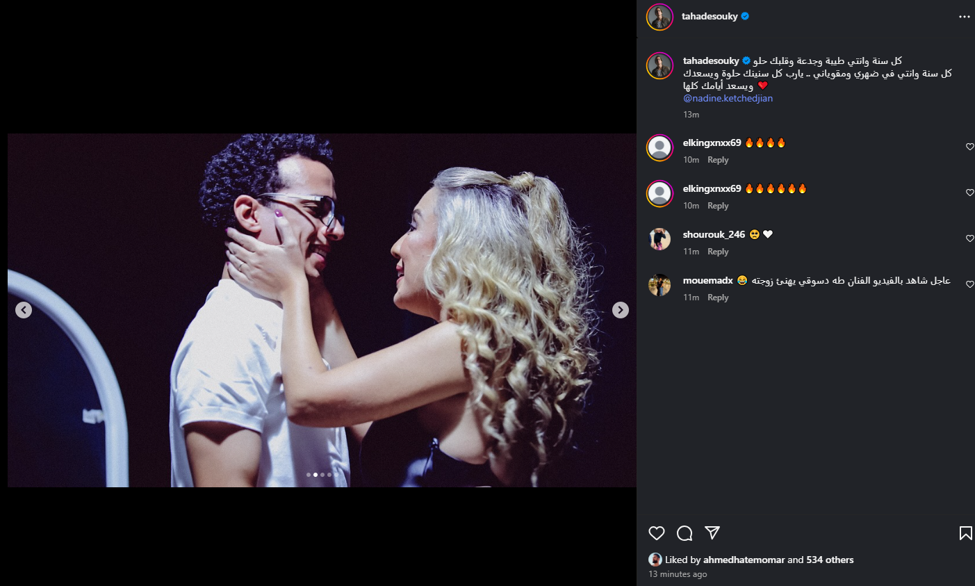 وشارك الفنان طه دسوقي، مجموعة صورة تجمعه بزوجته، وفقا لما رصده موقع تحيا مصر، عبر صفحته الرسمية على موقع التواصل الاجتماعي إنستجرام وعلق عليها: كل سنة وانتي طيبة وجدعة وقلبك حلو، كل سنة وانتي في ضهري ومقوياني، يارب كل سنينك حلوة ويسعدك ويسعد أيامك كلها.