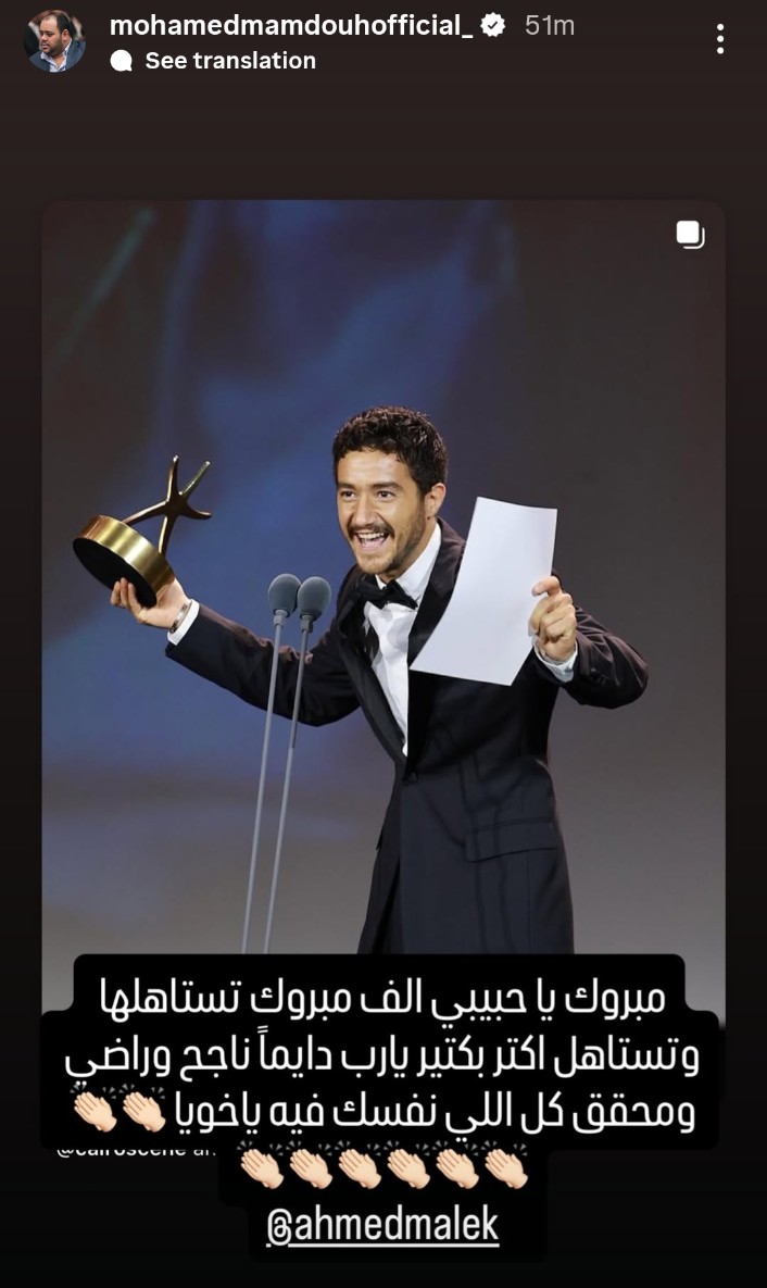 ونشر الفنان محمد ممدوح عبر حساباته على مواقع التواصل الاجتماعي رسالة عبّر فيها عن سعادته قائلاً: “مبروك يا حبيبي، ألف مبروك، تستاهلها وتستاهل أكتر بكتير، يا رب دايمًا ناجح وراضي ومحقق كل اللي نفسك فيه يا خويا”، ولاقت الكلمات البسيطة والعفوية من ممدوح تفاعل واسع من الجمهور ومحبيهما خاصة وأن كليهما ينتمي إلى جيل شاب استطاع أن يثبت حضوره بقوة في السينما المصرية خلال السنوات الأخيرة.
