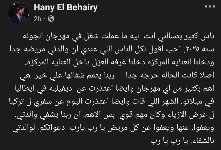 في منشور عبر حسابه على موقع فيسبوك رصده موقع تحيا مصر، أوضح هاني البحيري أن والدته تمر بوعكة صحية شديدة، وأنها حالياً تتلقى الرعاية في العناية المركزة، وقد تم وضعها في غرفة العزل نظرًا لحساسية الحالة، وأكد المصمم أن اهتمامه بصحة والدته يأتي على رأس أولوياته، مشيرًا إلى أن التزامه برعايتها جعل كل المهرجانات وعروض الأزياء مؤجلة أو ملغاة، بما فيها ديفيليه كان مقررًا في ميلانو الشهر الماضي، وعرض أزياء آخر في تركيا كان من المفترض أن يشارك فيه مؤخرًا. وأضاف: "هي أهم بكثير من أي مهرجان، ودعواتكم لها بالشفاء هي كل ما أطلبه الآن"، وهذا الاعتذار جاء في وقت كان الجمهور يتوقع فيه رؤية توقيع البحيري على أبرز الإطلالات السينمائية، خاصة وأن حضوره أصبح علامة فارقة في المهرجانات العربية والدولية، حيث يشتهر بإبداعه في تصميم الفساتين الراقية وإضفاء لمسة فنية على كل ظهور لفنانة.
