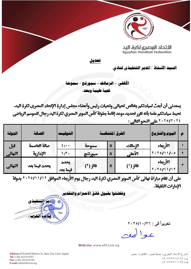 الاتحاد المصري لكرة اليد يعلن مواعيد بطولة السوبر