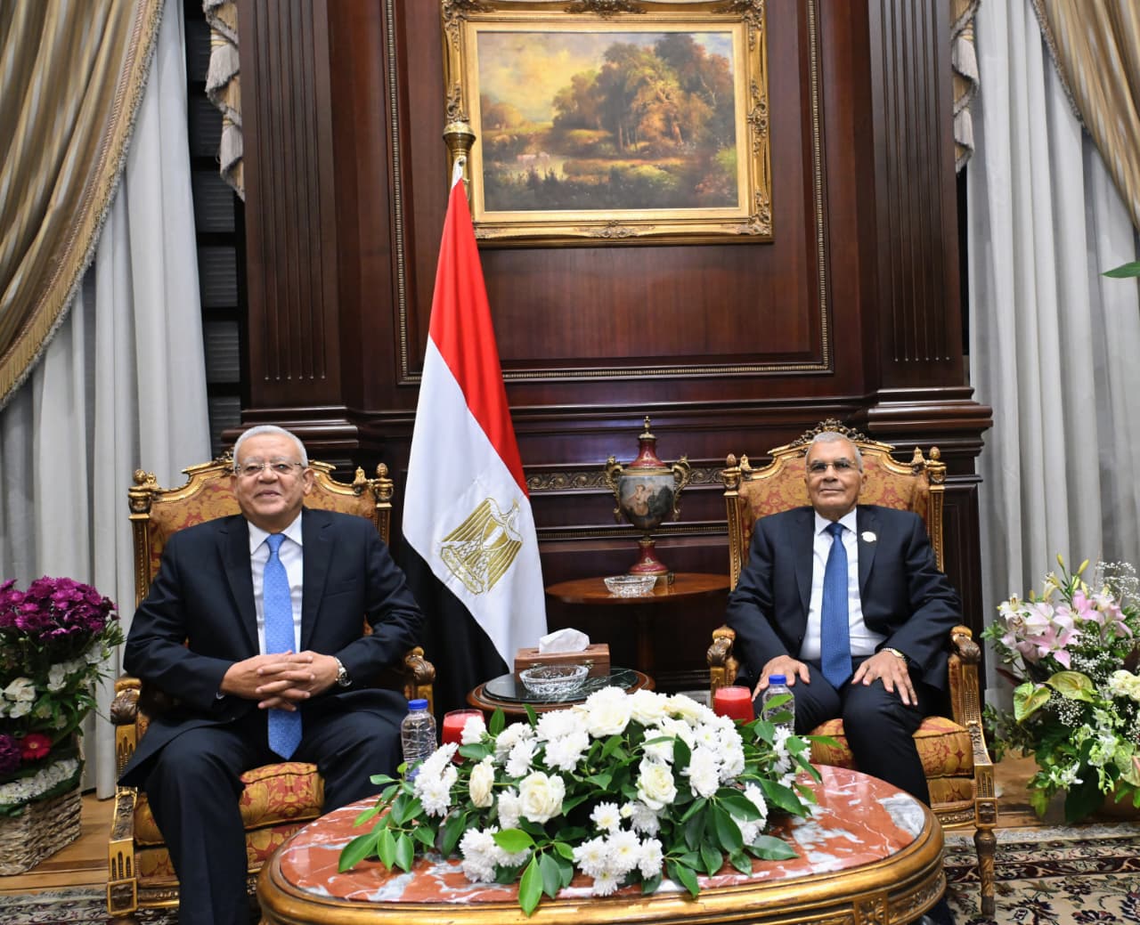 استقبل المستشار عصام فريد، رئيس مجلس الشيوخ، اليوم بمقر المجلس، المستشار الدكتور حُنفي جبالي، رئيس مجلس النواب، برفقة وفد من المجلس ضمَّ المستشار أحمد سعد الدين، والنائب محمد أبو العينين، وكيلي المجلس، والمستشار أحمد مناع، الأمين العام لمجلس النواب.