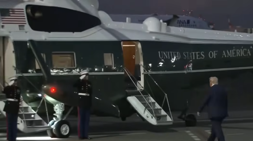 وفي الساعة5:11 مساءً، خرج ترامب من طائرته مرتديًا بدلةً كحلية وربطة عنق صفراء، ونزل الدرج. استقبله على مدرج المطار مسؤولون يابانيون وأمريكيون، بمن فيهم السفير الأمريكي لدى اليابان، جورج غلاس. ثم توجه الرئيس فورًا إلى مروحيته التي كانت بانتظاره.