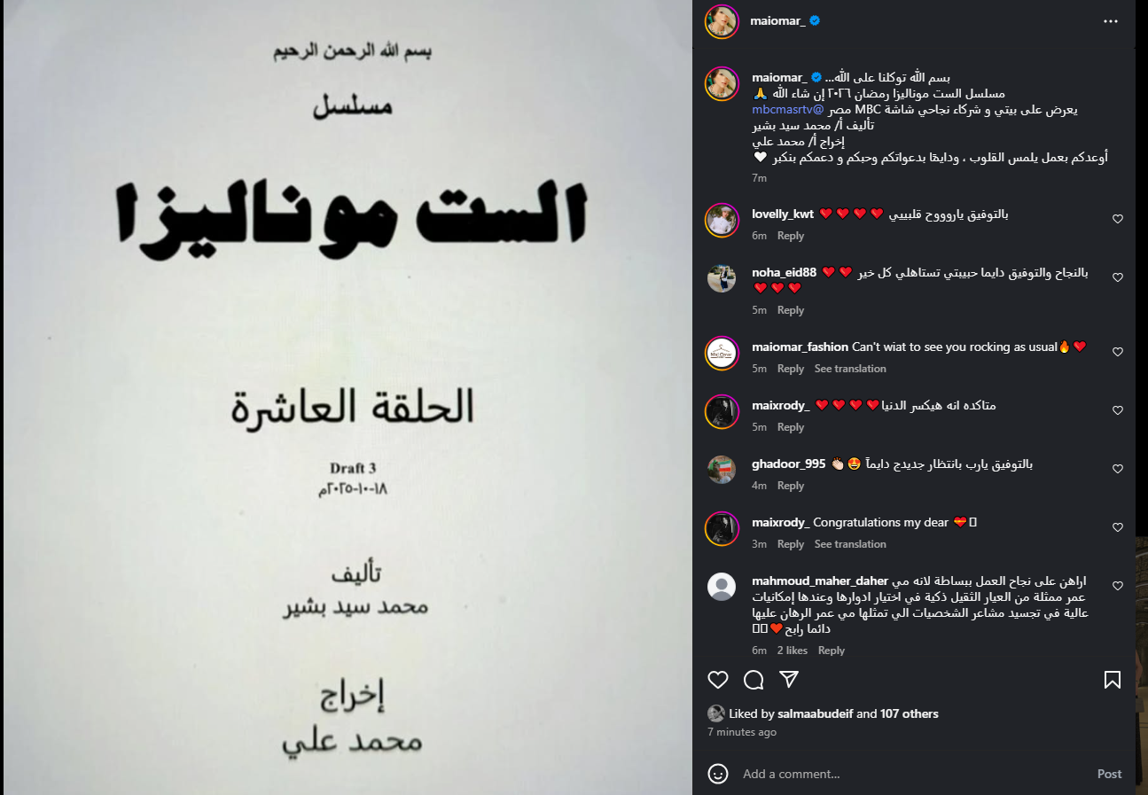 وشاركت الفنانة مي عمر، صورة من الاسكريبت الخاص بالعمل، وفقا لما رصده موقع تحيا مصر، عبر صفحتها الرسمية على موقع التواصل الاجتماعي إنستجرام، وعلقت عليها: بسم الله توكلنا على الله، مسلسل الست موناليزا رمضان 2026 إن شاء الله، يعرض على بيتي و شركاء نجاحي شاشة MBC مصر، تأليف أ/ محمد سيد بشير، إخراج أ/ محمد علي، أوعدكم بعمل يلمس القلوب ، ودايمًا بدعواتكم وحبكم و دعمكم بنكبر.