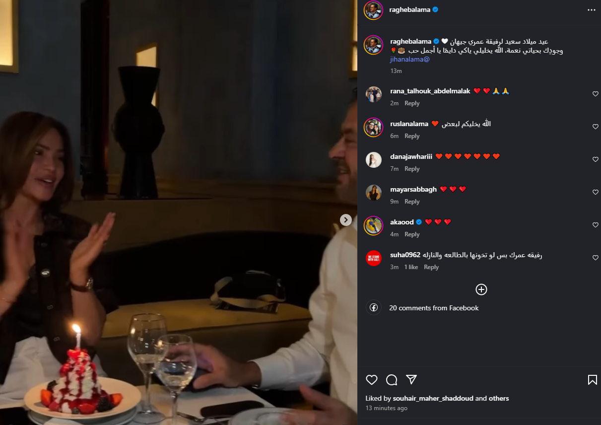 وشارك الفنان راغب علامة عدد من الفيديوهات التي تجمعه بزوجته، وفقا لما رصده موقع تحيا مصر، وذلك عبر صفحته الرسمية على موقع التواصل الاجتماعي إنستجرام وعلق عليه: عيد ميلاد سعيد لرفيقة عمري جيهان، وجودِك بحياتي نعمة، الله يخليلي ياكي دايمًا يا أجمل حب.