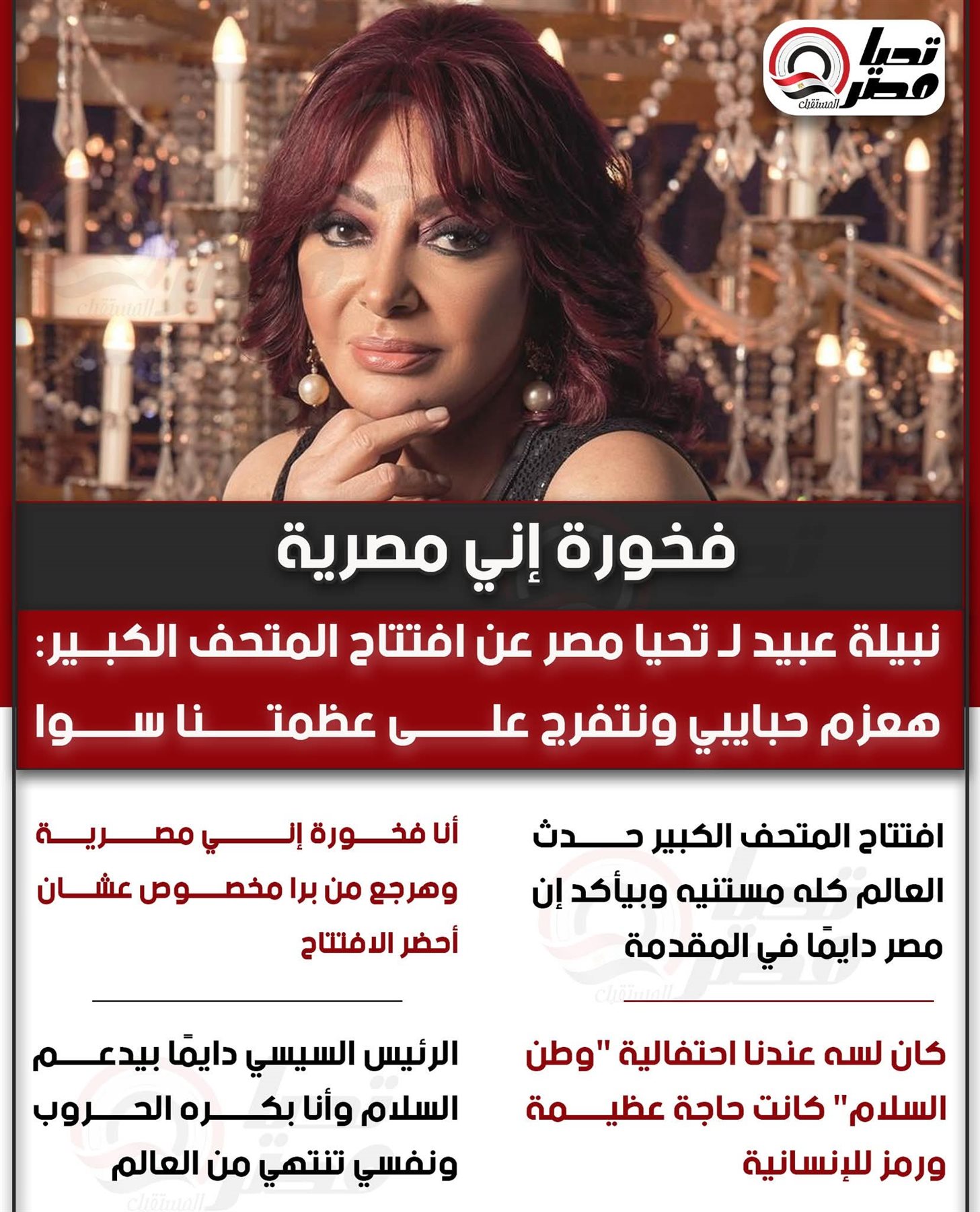 أعربت النجمة الكبيرة نبيلة عبيد عن فخرها واعتزازها بـ افتتاح المتحف المصري الكبير حيث عبرت عن انتمائها لمصر، مؤكدة أنه سيكون حدثًا تاريخيًا ينتظره العالم بأسره، مشيرة إلى أنه يعكس مكانة مصر العريقة وريادتها الدائمة في مجالات الحضارة والثقافة والفن.