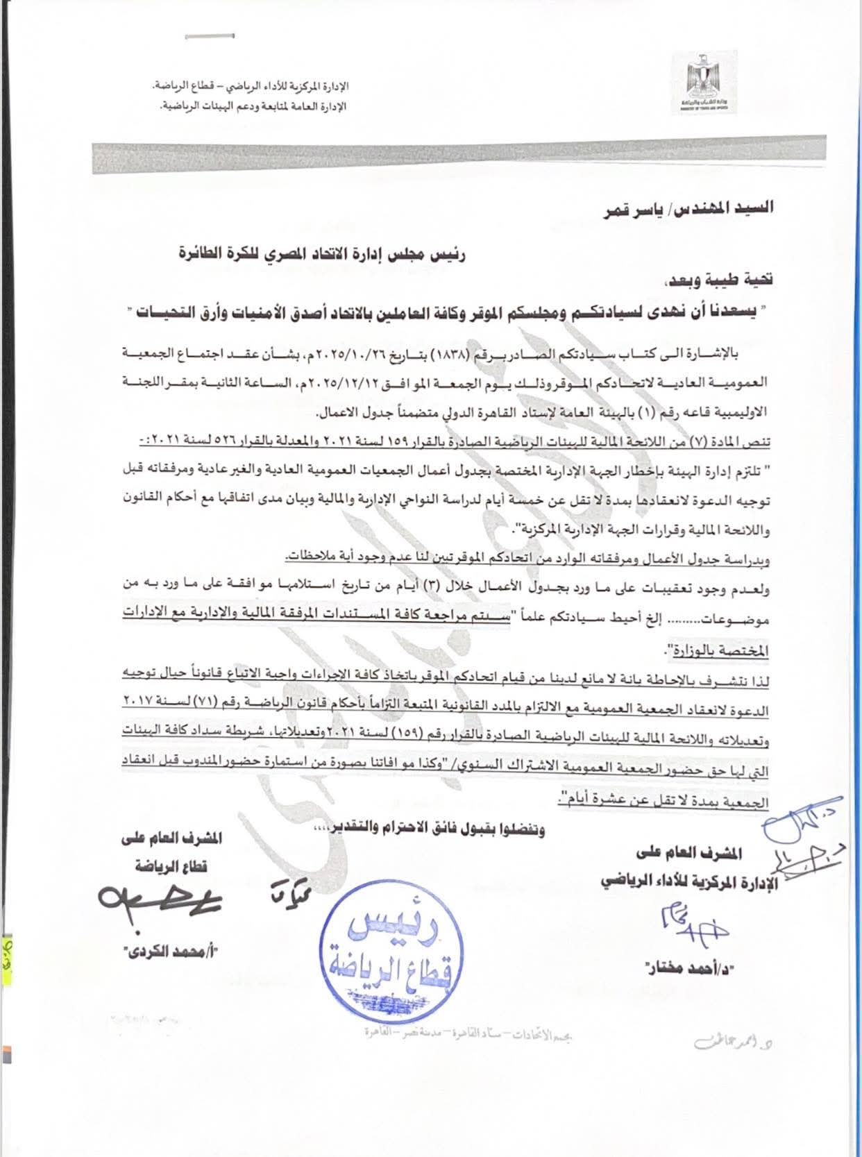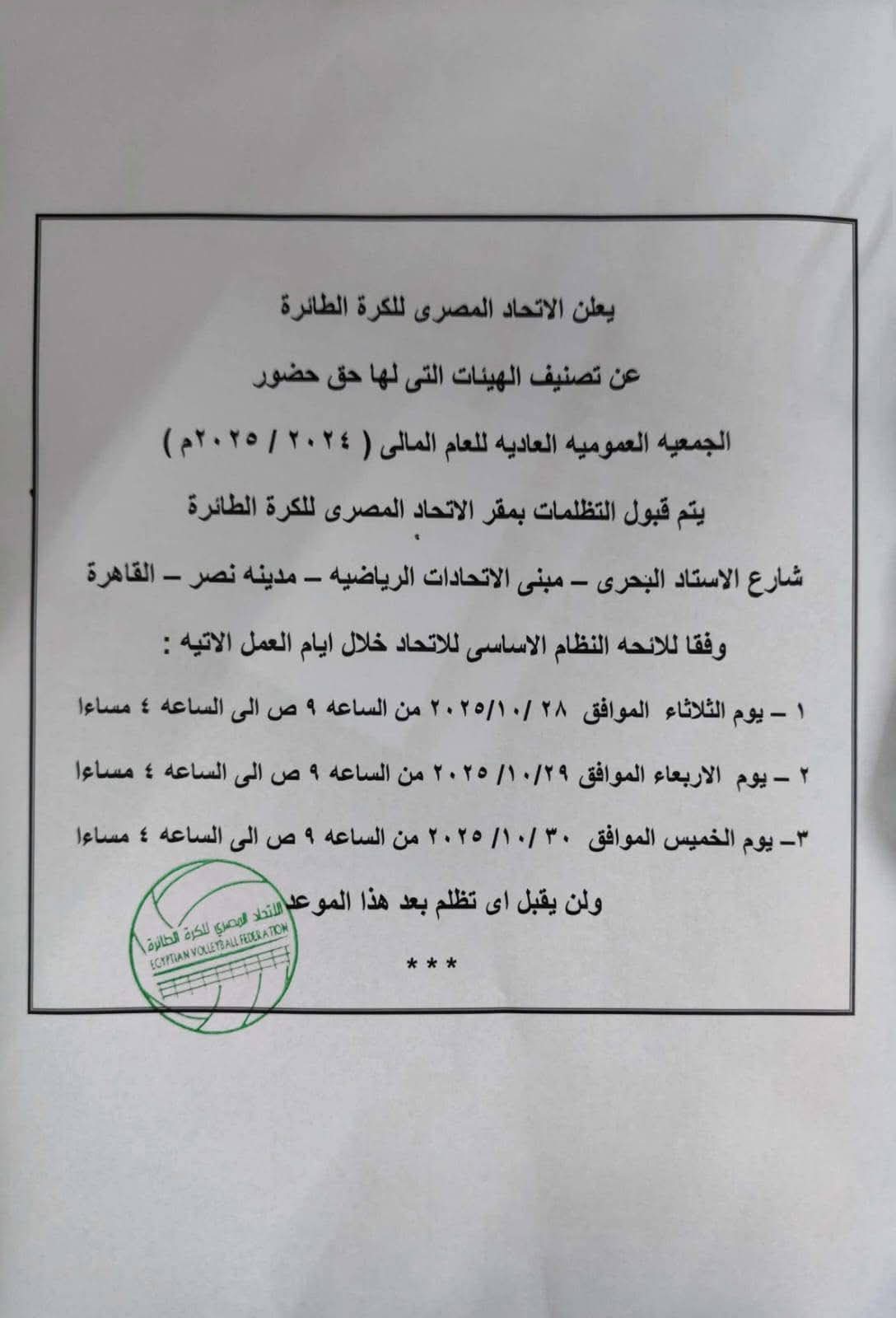 اتحاد الكرة الطائرة يعلن موعد انعقاد الجمعية العمومية العادية.. مستند