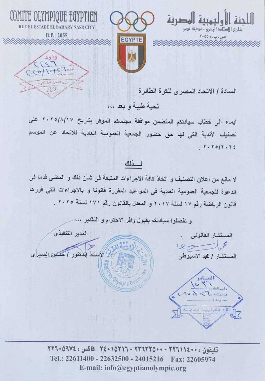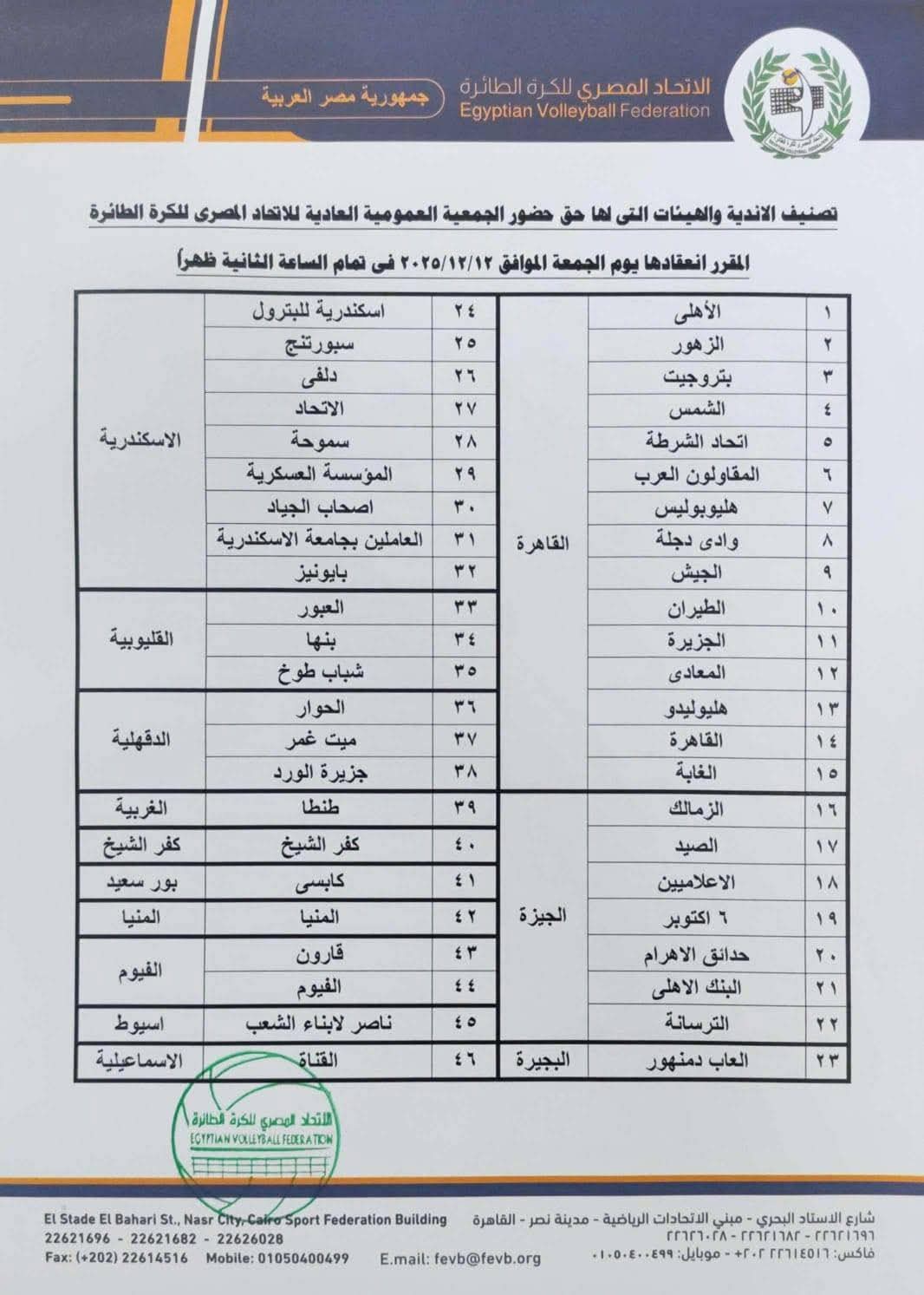 أعلن مجلس إدارة الاتحاد المصري للكرة الطائرة برئاسة المهندس ياسر قمر عن تصنيف الهيئات الرياضية التي لها حق حضور الجمعية العمومية العادية للاتحاد عن الموسم الرياضي (2024/2025).