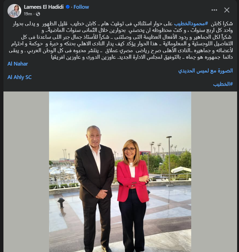 تحيا مصر، وكتب لميس الحديدي عبر حسابه الرسمي"فيس بوك": شكرا كابتن محمود الخطيب على حوار استثنائي فى توقيت هام .. كابتن خطيب قليل الظهور، و يدلى بحوار واحد كل اربع سنوات ، و كنت محظوظه أن يخصني بحوارين خلال الثمانى سنوات الماضيةً".