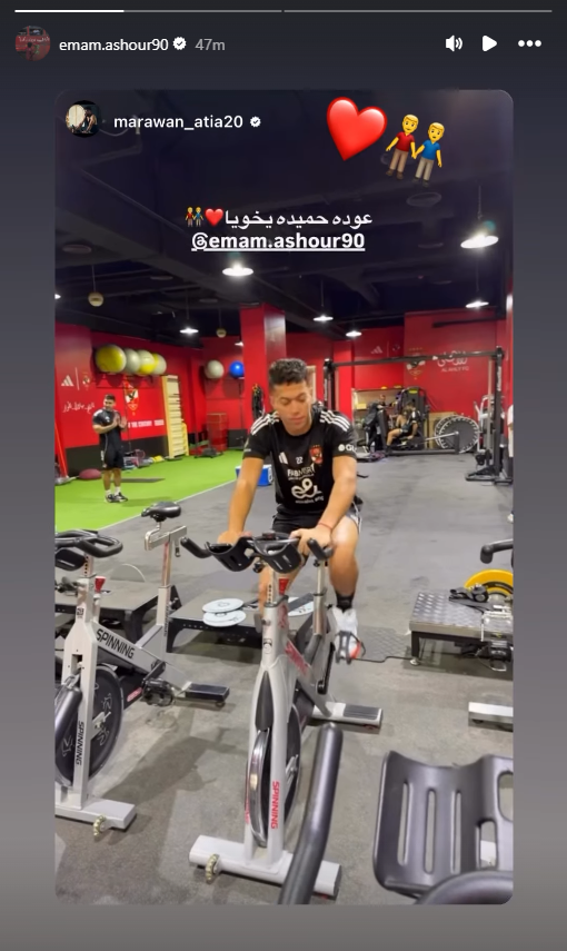 تحيا مصر، ونشر مروان عطية لاعب النادي الاهلي، صورة لإمام عاشور داخل صلات الجيم عبر حسابه الرسمي"إنستجرام"، معلقاً:" عودة حميدة يا أخويا".