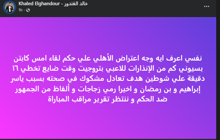 تحيا مصر، وكتب خالد الغندور عبر حسابه الرسمي"فيس بوك": نفسي اعرف ايه وجه اعتراض الأهلي علي حكم لقاء امس".