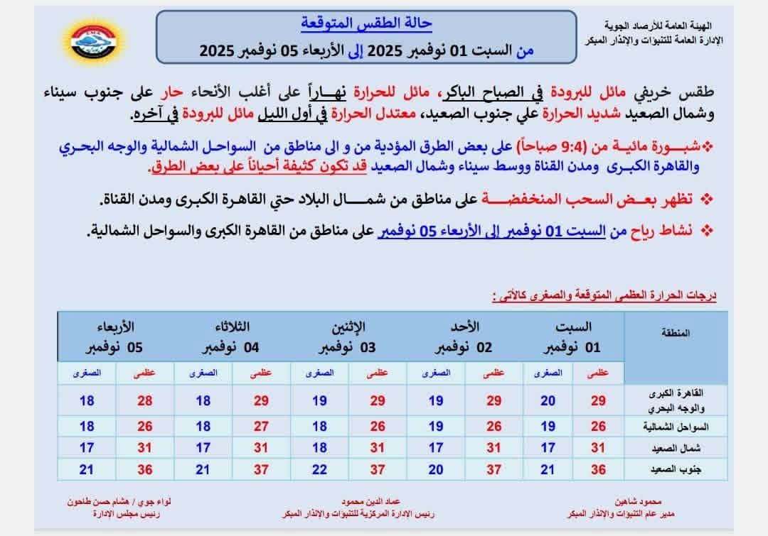توقعت الهيئة العامة للأرصاد الجوية أن يسود طقس خريفي نموذجي خلال الأيام المقبلة، حيث تستمر الكتل الهوائية الشمالية في التأثير على أغلب أنحاء الجمهورية، مما يجعل الأجواء معتدلة نهارًا ومائلة للبرودة في الصباح الباكر وأول الليل.