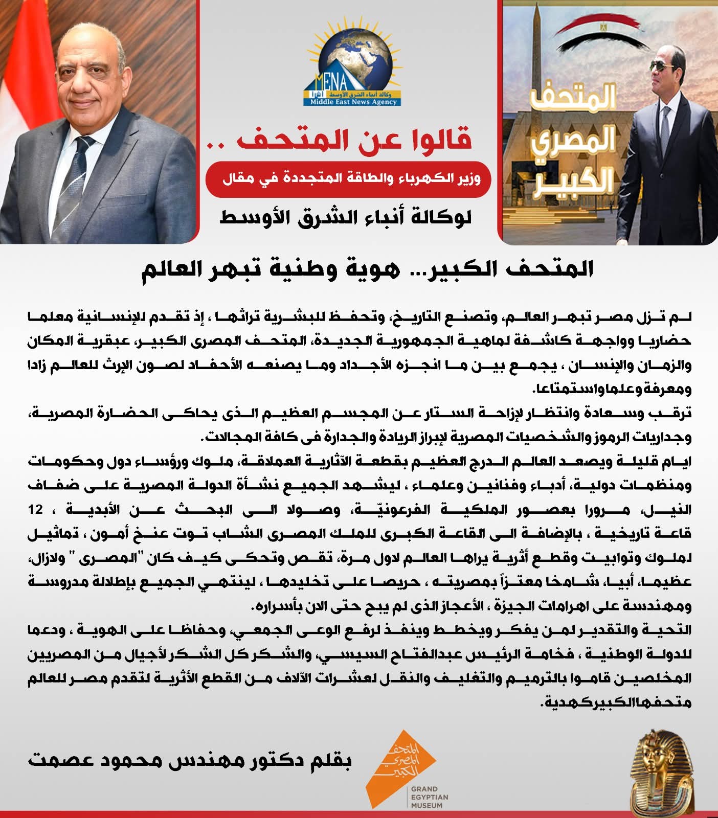 بقلم وزير الكهرباء: المتحف المصري الكبير هوية وطنية تبهر العالم