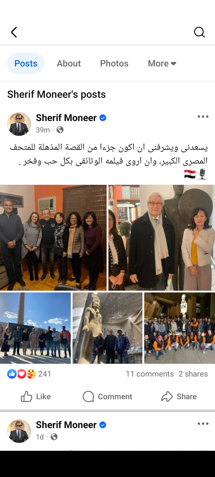 ونشر شريف منير مجموعة صور له من مشاركته في افتتاح المتحف المصري الكبير، في منشور رصده موقع تحيا مصر على حسابه الرسمي بموقع التواصل الاجتماعي فيسبوك: يسعدني ويشرفنى ان اكون جزءا من القصة المذهلة للمتحف المصرى الكبير، وان اروى فيلمه الوثائقى بكل حب وفخر .