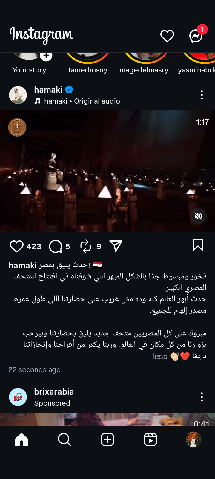 وكتب محمد حماقي في منشور رصده موقع تحيا مصر على حسابه الرسمي بموقع تبادل الصور والفيديوهات انستجرام: حديث يليق بحجم مصر.. فخور ومبسوط جدًا بالشكل المبهر اللي شوفناه في افتتاح المتحف المصري الكبير.. حدث أبهر العالم كله وده مش غريب على حضارتنا اللي طول عمرها مصدر إلهام للجميع.