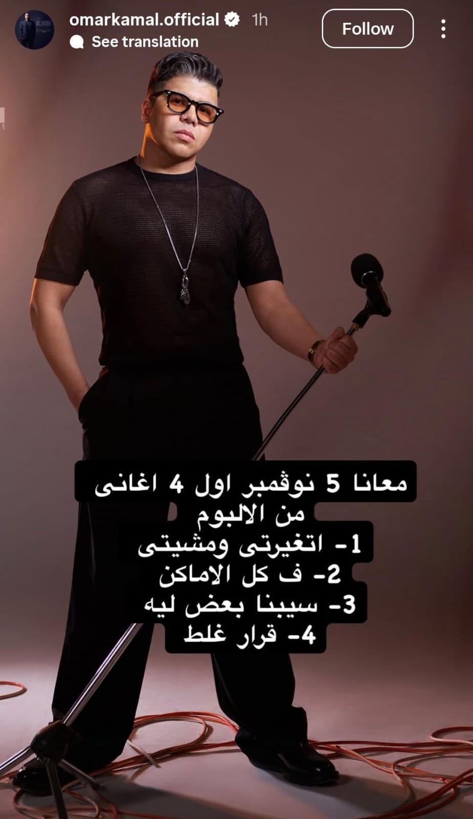 وكتب عمر كمال في منشوره الذي يرصده موقع تحيا مصر:معانا 5 نوفمبر أول 4 أغاني من الألبوم، اتغيرتي ومشيتي، في كل الأماكن، سيبنا بعض ليه، قرار غلط.