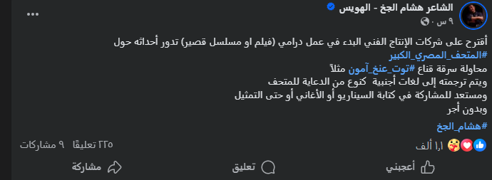 وكتب الشاعر خشام الجخ، منشورا، يعلن خلاله استعداده عن تقديم فكرة عمل فني عن المتحف المصري، وفقا لما رصده موقع تحيا مصر، عبر صفحته الرسمية على موقع التواصل الاجتماعي فيسبوك، قال فيه: أقترح على شركات الإنتاج الفني البدء في عمل درامي (فيلم او مسلسل قصير) تدور أحداثه حول المتحف المصري الكبير، محاولة سرقة قناع توت عنخ آمون مثلاً، ويتم ترجمته إلى لغات أجنبية كنوع من الدعاية للمتحف، ومستعد للمشاركة في كتابة السيناريو أو الأغاني أو حتى التمثيل، وبدون أجر.