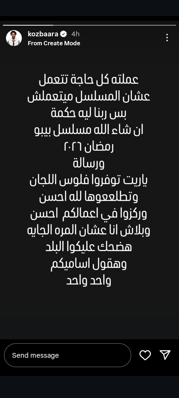وكتب كزبرة في منشور رصده موقع تحيا مصر على حسابه الرسمي بموقع تبادل الصور والفيديوهات انستجرام: "عملتوا كل حاجة تتعمل عشان المسلسل ميتعملش بس ربنا ليه حكمة، إن شاءالله مسلسل بيبو، رمضان 2026".