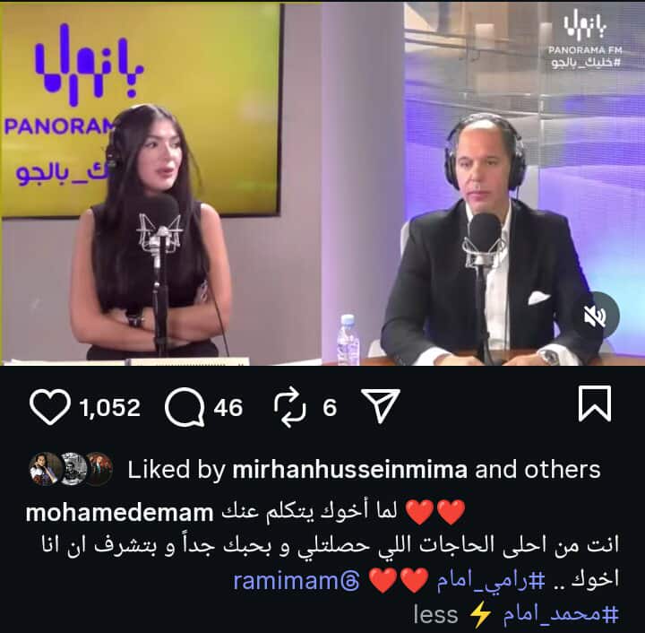 من جانبه رد الفنان محمد إمام على إشادة رامي إمام، قائلا: لما اخوك يتكلم عنك.. انت من أهم الحاجات اللي حصلتلي وبحبك جدا وبتشرف ان أنا اخوك.