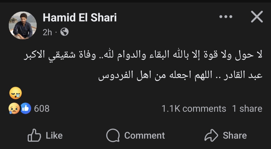 أعلن المطرب والملحن حميد الشاعري، عبر صفحته الرسمية على موقع التواصل الاجتماعي فيسبوك، وفاة شقيقه الأكبر عبد القادر، في منشور مؤثر قال فيه: "لا حول ولا قوة إلا بالله، البقاء والدوام لله.. وفاة شقيقي الأكبر عبد القادر، اللهم اجعله من أهل الفردوس."