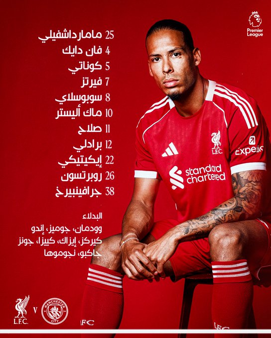 - تشكيل ليفربول الرسمي ضد مانشستر سيتي في الدوري الإنجليزي الممتاز